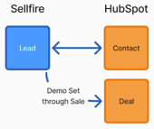Connect the Sellfire Lead to the HubSpot Contact bidirectionally, and push from Sellfire to the HubSpot Deal at the time of demo set through sale.