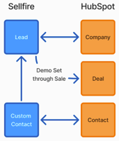 Connect the Sellfire Lead to the HubSpot Company bidirectionally, and push from Sellfire to the Deal at the time of demo set through sale; connect a Sellfire custom object (Contact) to the HubSpot Contact object bidirectionally.