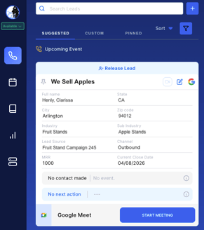 - When viewing a Lead Card, click the Google Meet icon