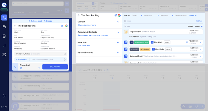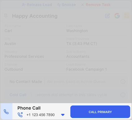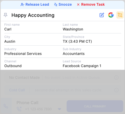 In this section, the Lead Card is automatically expanded so that you can easily see the most-important information and history attached to the lead and quickly take actions on the lead (call, email, SMS, skip, release).