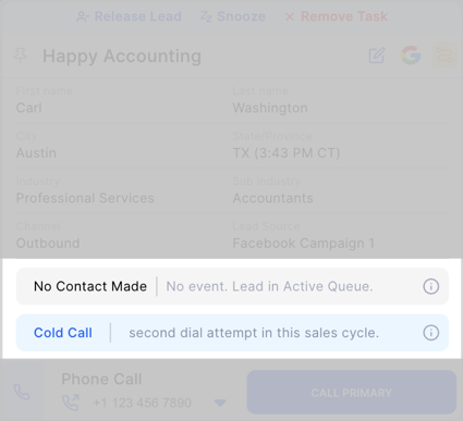 | 1) Pipeline Stage, future event date/time, date/time the lead will reappear in the Suggested Queue. 2) Type of call and number of dial attempts in the current sales cycle. |