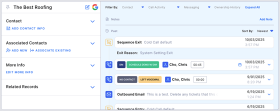 Contact info, additional lead info, & history