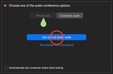 - If you are already using computer audio, click the arrow next to the microphone icon at the bottom left of the Zoom screen, leave computer audio, and then click Join Audio.