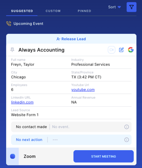 - When the event is approaching and within the timeframe configured by Enablement users in System Configuration > Lead Management > Lead Ranking, it can be started using the large Start Meeting button on the lead card that populates in the Upcoming Events section at the top of the Suggested Queue.